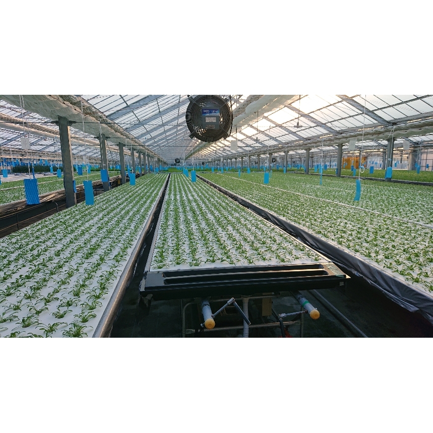 三菱アグリドリームのナッパーランドにて養液栽培。苗テラスにて播種(発芽及び定植迄10日間)➡太陽光栽培にて苗テラスより移植(15日~25日)➡収穫➡運搬➡冷蔵庫➡包装➡冷蔵庫保管➡出荷。