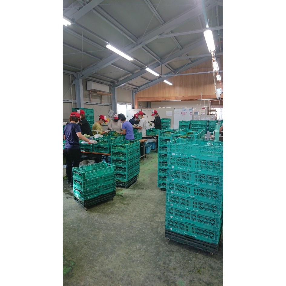 栽培ハウスへ入る時は必ずエアーシャワーを通過。栽培時無農薬。消毒に関しては次亜塩素酸ソーダのみを使用。栽培面積は1,200坪。日量3000㎏。年間110トン生産します。ハウスでの水耕委栽培施設作業所での加工・梱包作業苗テラス